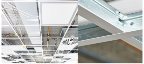 De kantlat wordt samen met de hoeklijn gemonteerd langs de gehele omtrek van een systeemplafond. Onder andere alle