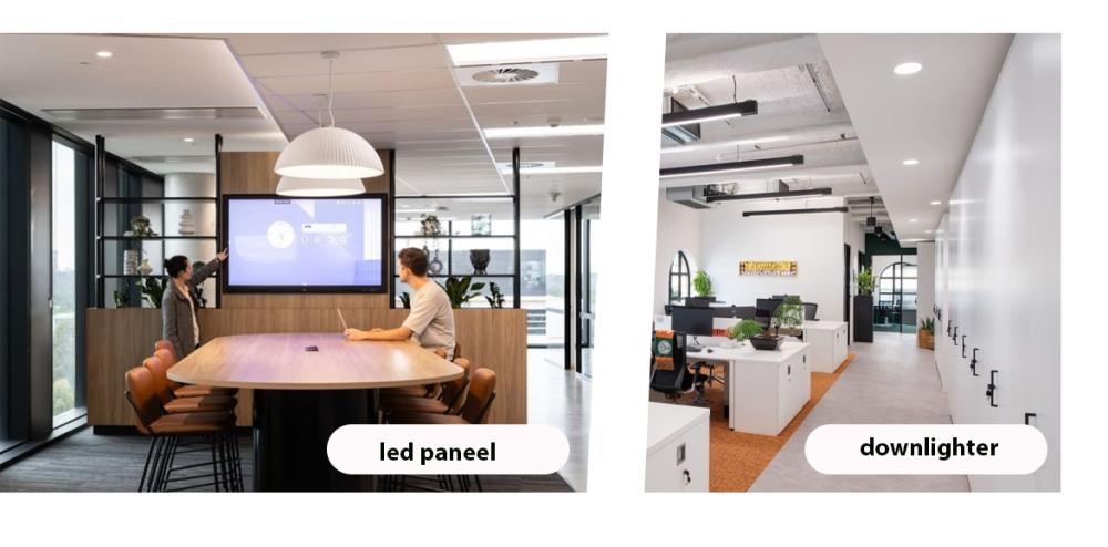 en werkplekken. - Downlighters zijn ronde panelen met een kleiner oppervlak die eveneens recht naar beneden schijnen. Deze worden